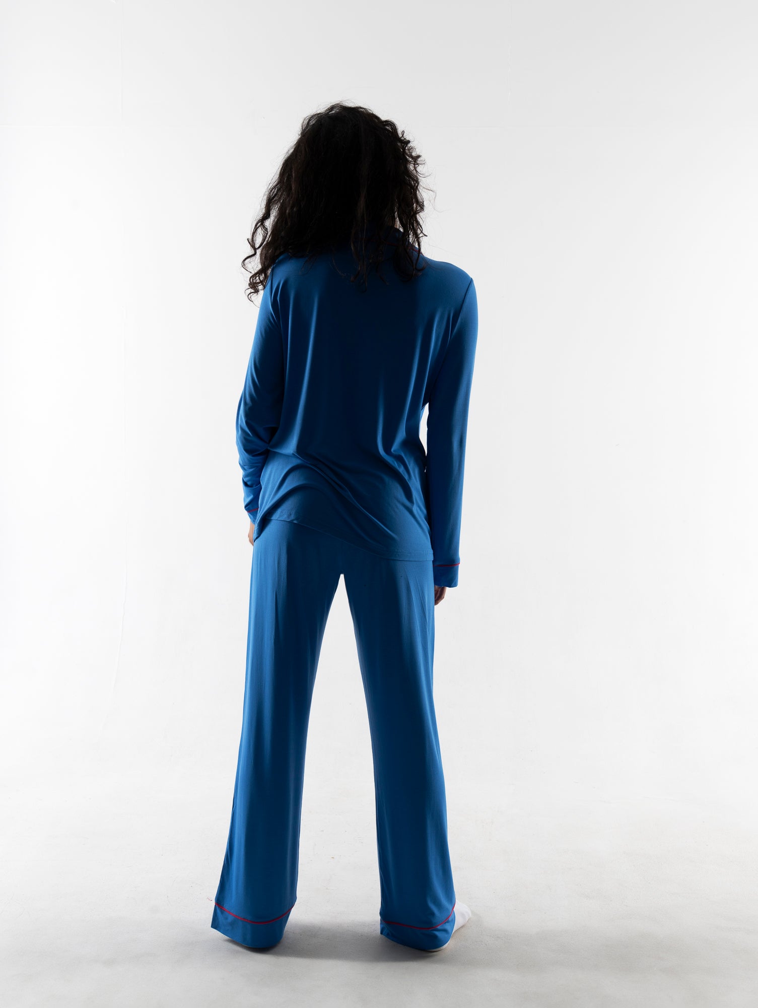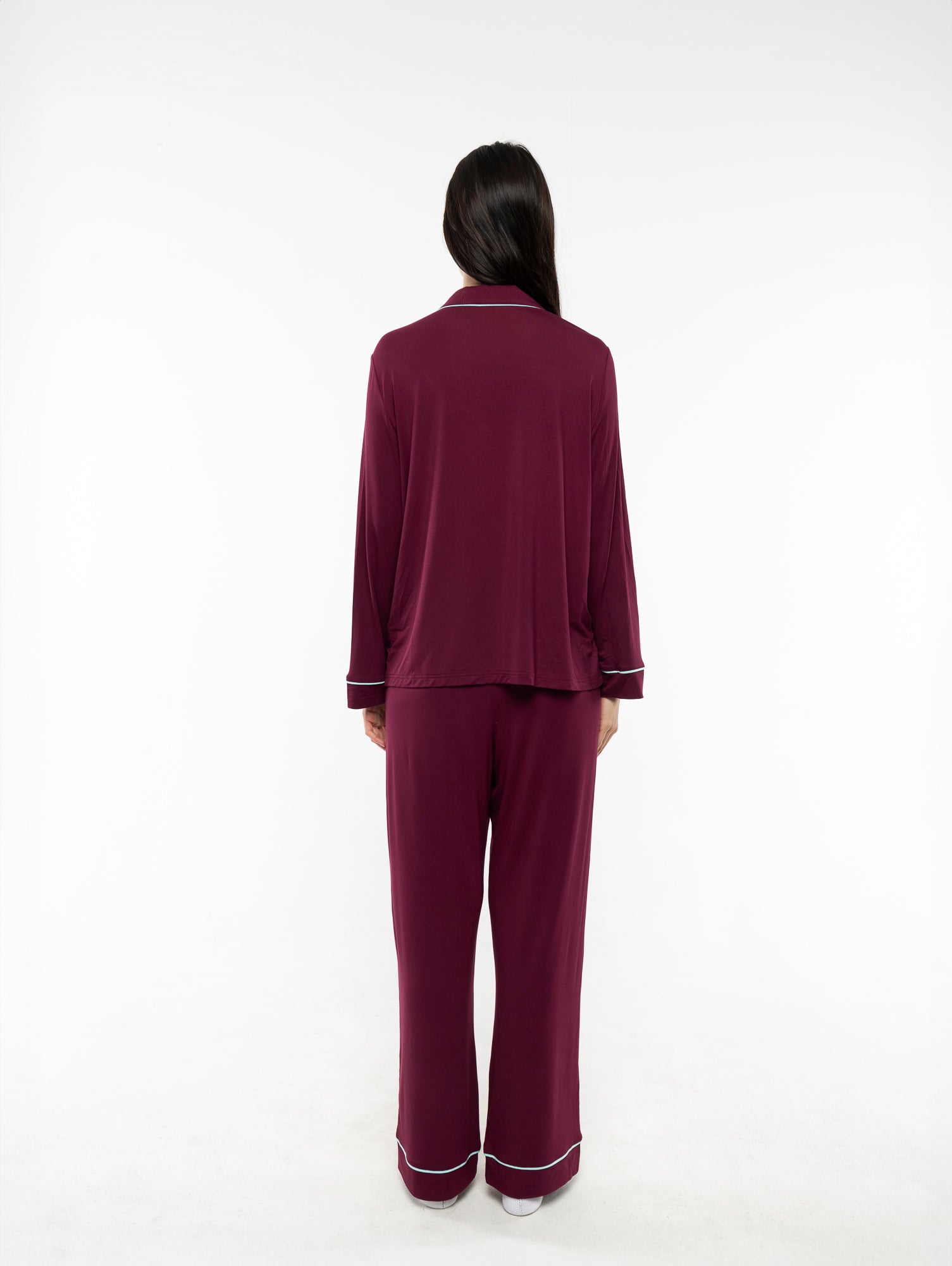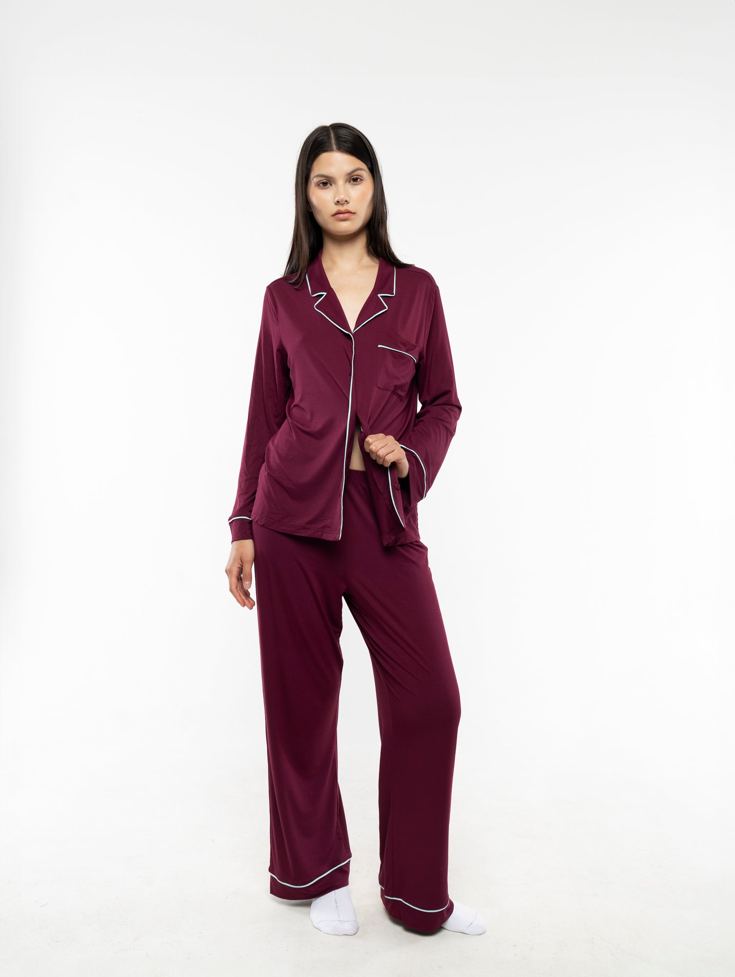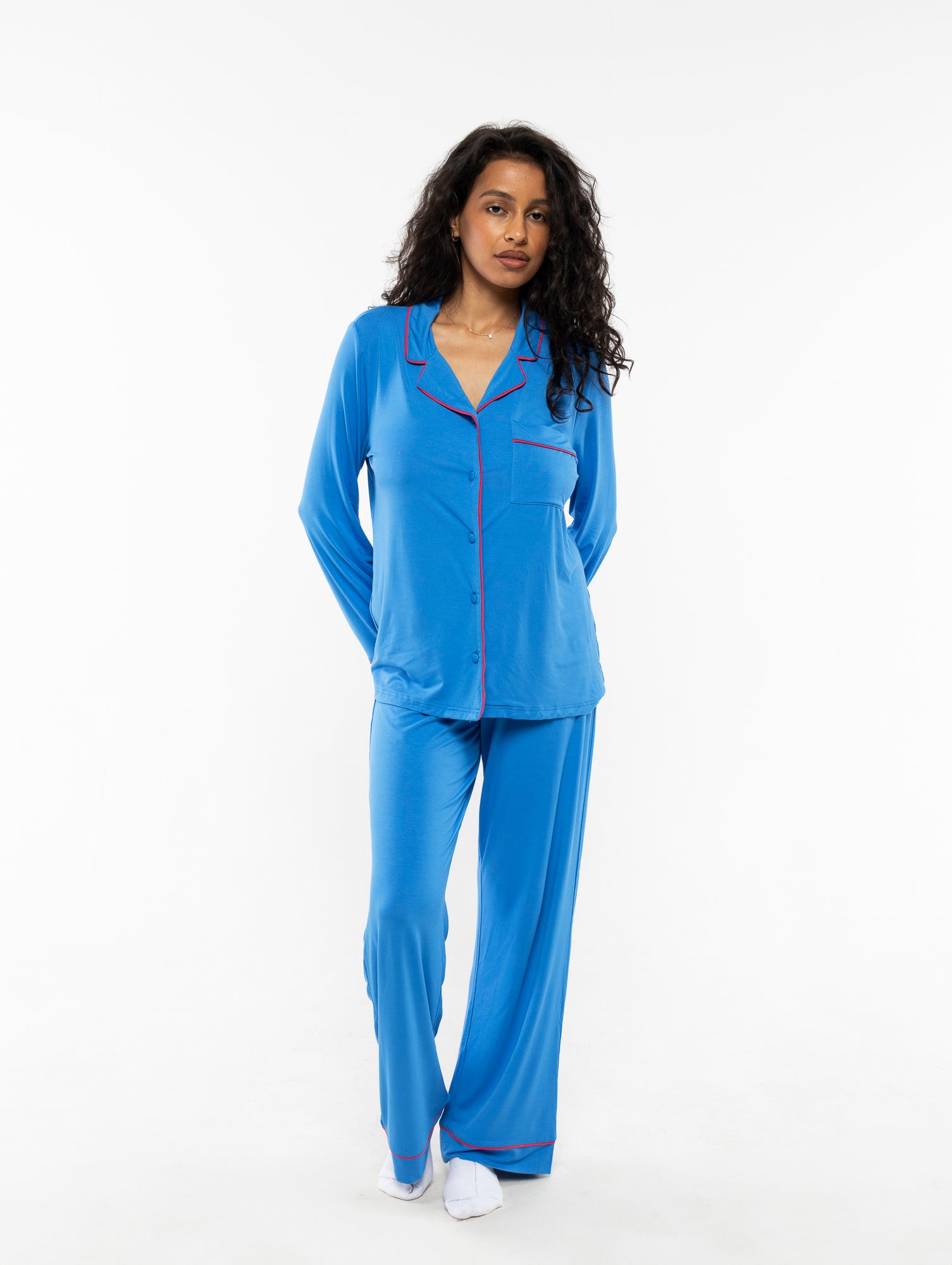 The Cloud Pajama Set, crafted from an ultra-soft bamboo fabric with a cool, breathable feel and a softly bouncy drape. A relaxed, long-sleeve silhouette, finished with contrast piping, fabric-covered buttons, and a front chest pocket.