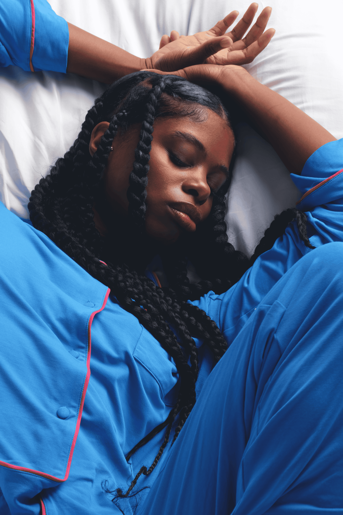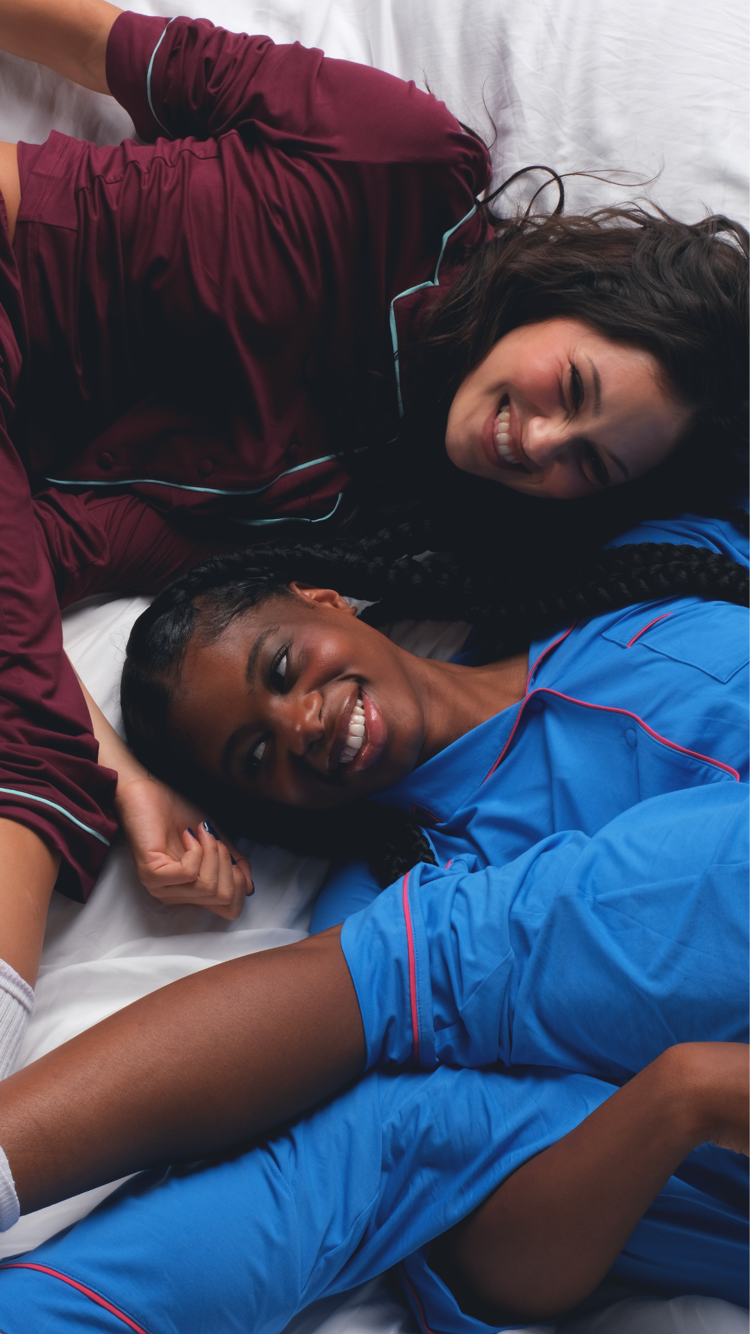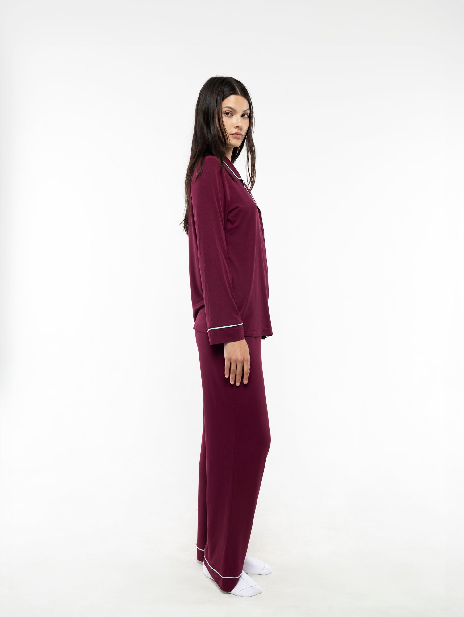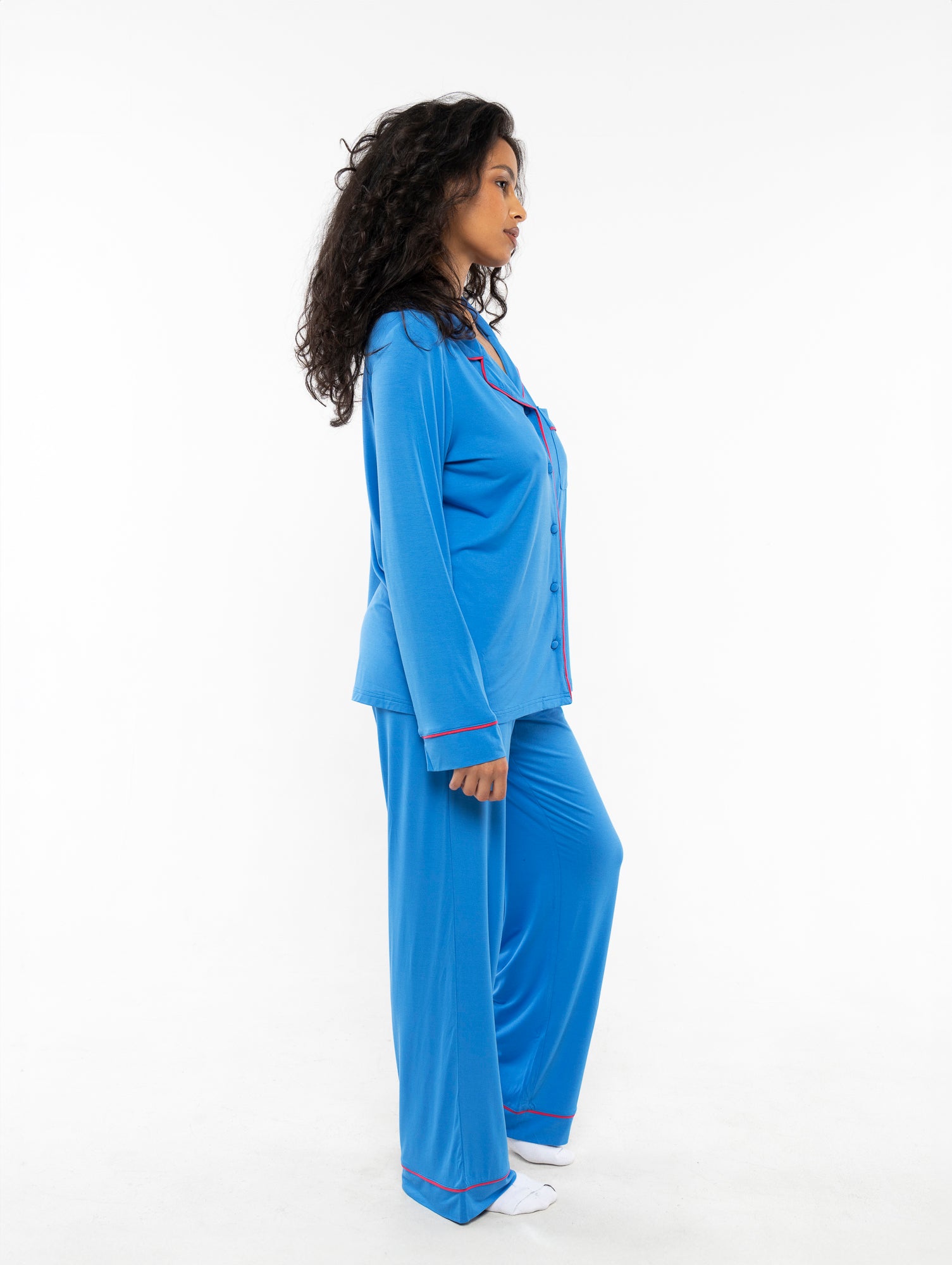 The Cloud Pajama Set, crafted from an ultra-soft bamboo fabric with a cool, breathable feel and a softly bouncy drape. A relaxed, long-sleeve silhouette, finished with contrast piping, fabric-covered buttons, and a front chest pocket.